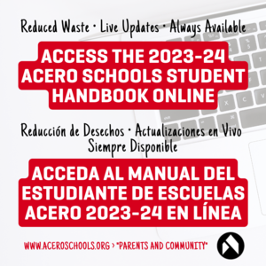 This year, to reduce waste and ensure families and colleagues always have access to the most up-to-date information, the Acero Schools Student Handbook is being made available online instead of using traditional hard copies. The Student Handbook can be accessed directly using the link below or at www.aceroschools.org under “Parents and Community,” and is available in both English and Spanish.